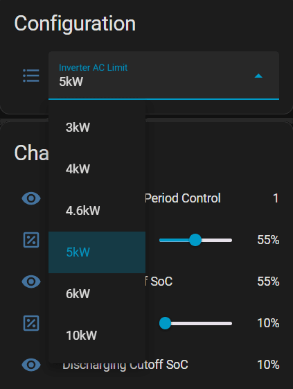 Currently the only required configuration option is selecting your Inverter’s AC Limit. This setting will adjust the range of the Force Charging/Force Discharging/Dispatch Power sliders and is also required for the Excess Export automation to function properly.