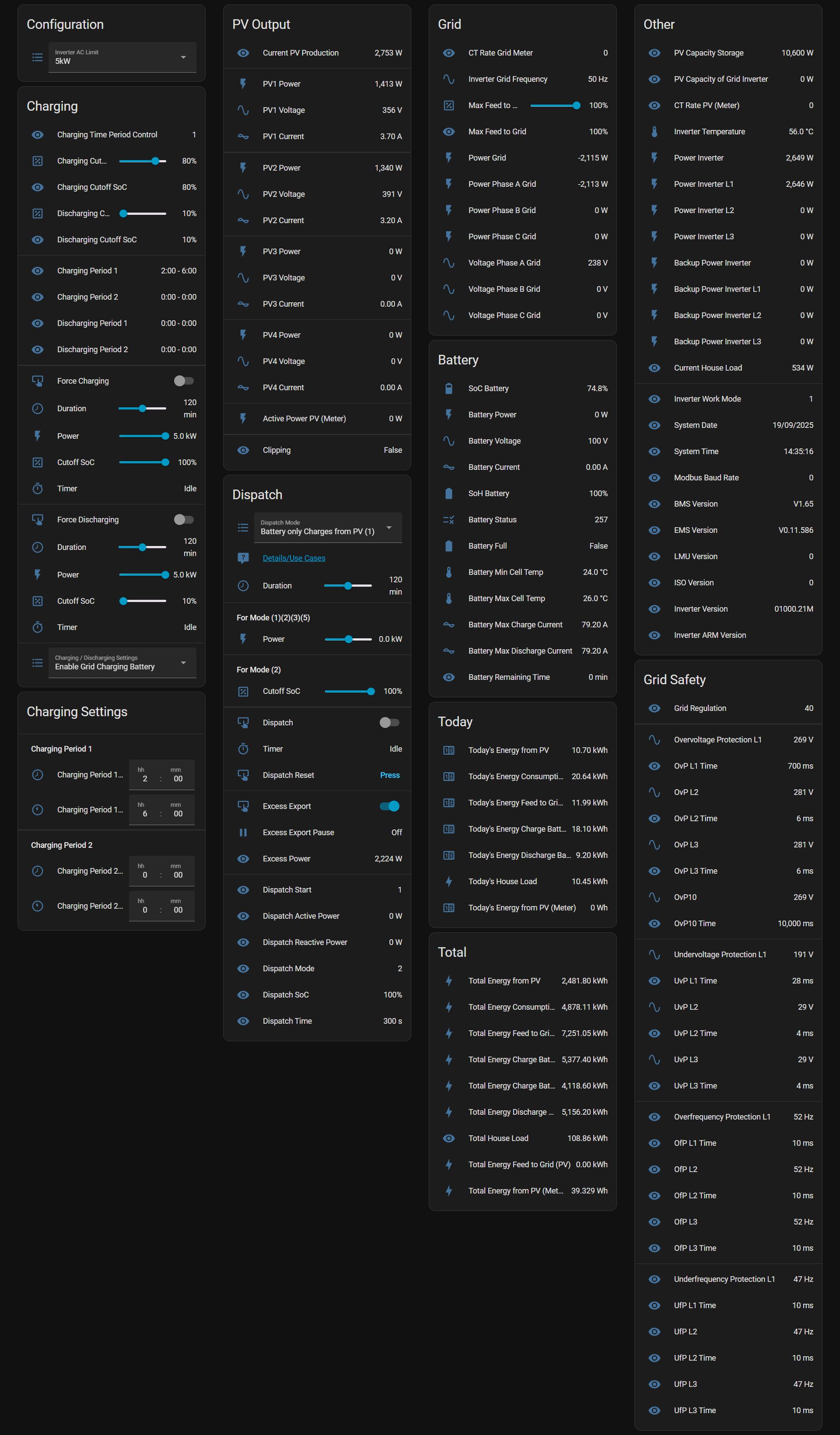 My system also contains a second inverter (a Sungrow SG10.17RT), which unfortunately does not provide reliable modbus data. While your integration is properly displaying the solar power of the string attached to the primary AlphaESS inverter, I don’t see the data of the other strings attached to the external inverter. But other values like “Feed to Grid” are correct and contain the power of full system.